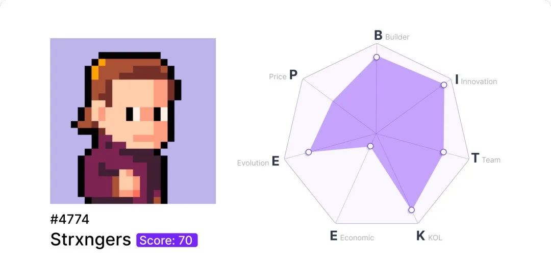 B ( Builder ) I ( Innovation ) T ( Team ) K ( KOL ) E ( Economic ) E ( Evolution ) P ( Price ) 今年 NFT 市场闯入了不少新老面孔。横空出世的 LooksRare 和 X2Y2 “吸血攻击”,交易额一度超越 OpenSea;Uniswap 收购聚合器 Genie,也开始切入 NFT 赛道;以 Solana 为代表的多链并存市场,瓜分了以太坊 17% 的市场份额。 竞争正在为这个年轻的市场注入新活力。市场壮大,交易规模持续增长,今年 5 月,以太坊链上 NFT 单日销量首度突破 6 亿美金;交易工具正在竞争中一步步迭代,批量上架与交易、“上架 NFT 即挖矿”……演进的玩法与功能激活了更大用户规模;与此同时,NFT 项目数也在井喷式爆发,玩家们在层出不穷的类型和作品面前挑花了眼。 Web3.0 多链钱包 BitKeep 自今年推出 NFT 市场板块以来,收录了六万多个 NFT 项目,创始人 Kevin 用了一年时间,参透了所有暴涨 NFT 项目的七大维度,本文来自 Kevin 的总结。 NFT 项目要吸引的目标用户应该是 Builder,而非羊毛党、短期套利者,这一点特别重要,也是对团队最大的考验。投机者常有,而 Builder 却难得。 Builder 因共鸣和认同感聚集在一起,比如代表后现代丧文化的 mfers,吸引了在工作压力和社会困境面前感到无力的千禧一代,在消极、迷茫甚至绝望的情绪漩涡中,人很容易被还原度很高的 NFT 角色打动并产生共情。由此诞生了自发性极强的社区。不同于需要团队宣发的项目,拥有 Builder 的 NFT 项目也就拥有了自愿维护和宣传社区理念与精神的成员。 mfer #6148 (Kevin 拍下的头像) 说起 Builder,我其实第一个想到的是比特币矿工,今天比特币的成功不是由投机者推动的,而是归功于无数矿工和布道者,挖矿、研究底层技术逻辑、翻译白皮书、写文章出书、做演讲、研发矿机……当它还是非常小众的新生事物时,Builder 就跃入未知世界,张开双臂拥抱不确定性,通过 Builder 自己的建设扩大项目的辐射范围,那种真诚的态度和信仰,那种不因利益驱使的心态,催生出改变世界的比特币。 每一个蓝筹项目都是独特的。 很多人认为,创新就是创造一个原先没有的、新的,这个理解其实不太准确,创新更常见的是变换一种思维方式和视角。大多数人不能创新的原因是,只拥有一种视角或者固守一种思维模式,比如看跑鞋火了,就去做个跑鞋仿盘。市场上的仿盘数不胜数,同质化的模仿只会让用户审美疲劳,如果在产品特色上乏善可陈,那一上线基本就可以宣告死亡了。 Web3 是一个鼓励创新的行业,创业者们需要时刻保持空杯的状态,丢掉旧式的思维框架,塑造自己产品的独特卖点。在 Web3,永远不会有下一个 CryptoPunks,不会有下一个无聊猿,不会有下一个 Azuki,不会有下一个 STEPN……因为每一个能被人记住的作品都和上一个完全不一样。没有人会为下一个猴子买单,因为人们只需要一个猴子,但是创新的项目会永无止境。 就像最近大热的 Strxngers,其独特的点在于揭示了当代新型社交关系:点赞之交,用敷衍的点赞行为表达人与人之间的一种状态,很符合 NFT 圈的氛围。这一概念具有较强的 meme 文化属性,在元宇宙,大家都是陌生人。 Strxngers 评分:70/100 成功 NFT 的背后总有一个深刻理解金融、共识、社区与艺术的团队。 在评估 NFT 项目时,团队综合实力是 BitKeep 重点考察的一个指标,过往成功案例、信用背书、人脉影响力、优秀作品创作能力、社区发展能力都是加分项。我大概把 NFT 团队分成四类: 1. 设计型:具备较强的美术能力和原创力,在商业化方向相对比较薄弱。具体代表比如 Azuki 这种画风精美、共创性不高的二次元日漫,无聊猿情绪各有千秋的动物拟人化作品,对团队审美和原创力要求较高。 2. 营销型:核心团队大多广告出身,具备较强的讲故事和营销能力。适用于一些美术创作门槛不高的作品,比如卡通画风的 Beans 和 Doodles,更看重团队的商业规划和执行力。 3. 资源型:团队在 Web3 圈人脉很广,且具备雄厚的资金实力。像 NFT 市场早期原住民 CryptoPunks、Crypto 巨鲸推出的 Moonbirds,都是这一类型。 4. 深耕型:在 NFT 领域拥有扎实深刻的思考,目标长期经营可持续的商业化项目。可以这么说,大多脱颖而出、经过市场验证的项目基本也都属于这个类型。 完成创业团队调研后,我常会提问:这个项目是否获得了 KOL 的广泛关注?是否成为社区意见领袖青睐的作品? 巨鲸也好,KOL 也好,是这个 NFT 社区从显性上来看和整个 Web3 行业沟通的方式。 前面我们提到的创新、团队实力,这些所有的努力一定会得到像 KOL 的肯定,这是侧面印证项目可行性的方式。如果再好的项目,却没有任何一个有影响力的人对他们表达好感、善意,或者持有他们的 NFT,那这个项目想获得受众认可、在用户圈层建立联结、证明作品价值是几乎不可能的事。 像前文提到的 Builder,判断一个社区用户是否为 Builder,一个基本标识在于,他是否愿意用 NFT 图片做头像,挂在推特、脸书或电报上。那么同理,判断一个 KOL 是否认可项目,也是看他是否真正使用这个 NFT。获得 KOL 的认可,也是 BAYC 的成功密码。 BAYC 评分:93/100 我们以前觉得 NFT 只是 NFT,但渐渐发现,从 AXS,到 MANA 和 SAND,到 APE,到 GMT,暴涨 NFT 背后都有一个完善的通证经济系统。 NFT 项目想要打动受众要靠实质的内容,但是内容所包含的并不单单只是一张图、一个美术设计,NFT 卖的是对投资者未来权益所作的承诺,这些权益包括潜在的涨幅、持有红利或其它衍生福利。 想做好一套