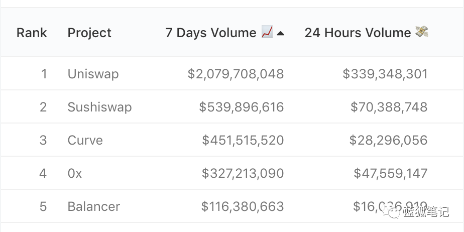如今Sushiswap的流动性和交易量虽然不如Uniswap,但也在DEX领域位居前列。截止到蓝狐笔记写稿时,其流动性达到9.15亿美元,七日平均交易量达到7,700万美元,虽然距离Uniswap的16.9亿美元的流动性,以及2.97亿美元的七日平均交易量还有较大差距,但Sushi swap的这个成绩暂时超过了曾稳居第二的Curve。