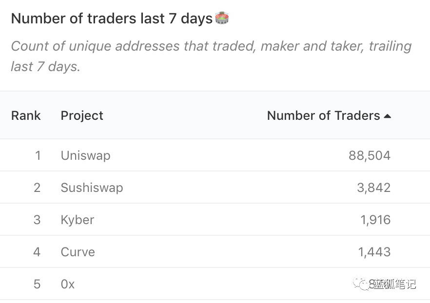 (Sushiswap最近7天的交易用户数排名第二,dunenalytics)
