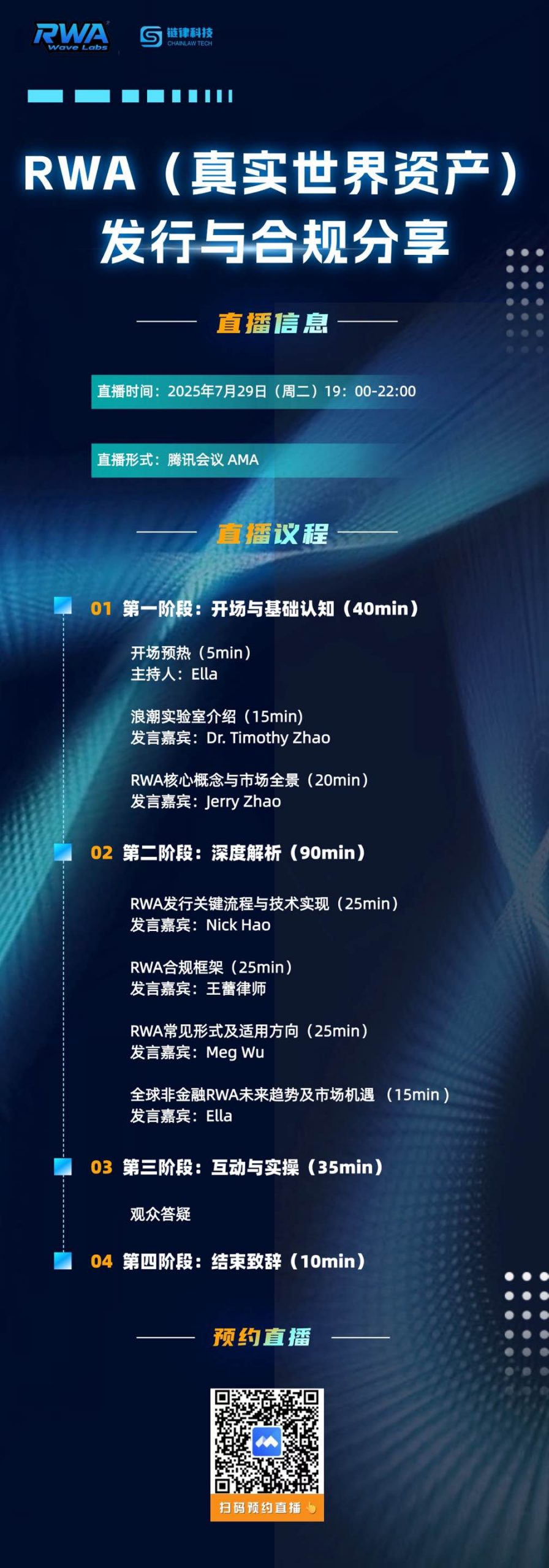 星空财经消息,2025 年 7 月 29 日 19:00 – 21:20,由RWA浪潮实验室(RWA Wave Labs)、链律科技(CHAINLAW TECH)联合主办的专题《直播活动RWA(真实世界资产)发行与合规分享》即将举行。