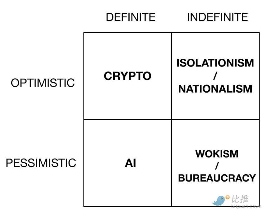 多年来,我一直铭记着 Peter Thiel 提出的简化版 2×2 乐观主义与悲观主义框架。他巧妙地用「当你手握一把锤子,万物皆似钉子」的比喻,阐述了这一观点。Peter Thiel 进一步区分了悲观主义和乐观主义的确定与不确定两种形态。