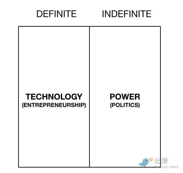 我将政治与科技的关系视为「明确」与「不明确」之间的垂直分界线。这是因为政治的核心并非创造财富,而在于治理与分配。即便是在最佳状态下,政治也只是技术和创业精神的助推器。然而,就其本质而言,政治并不能开创未来。真正创造未来的是技术。它是社会发展的基石,是推动人类之间信息交流的网络。