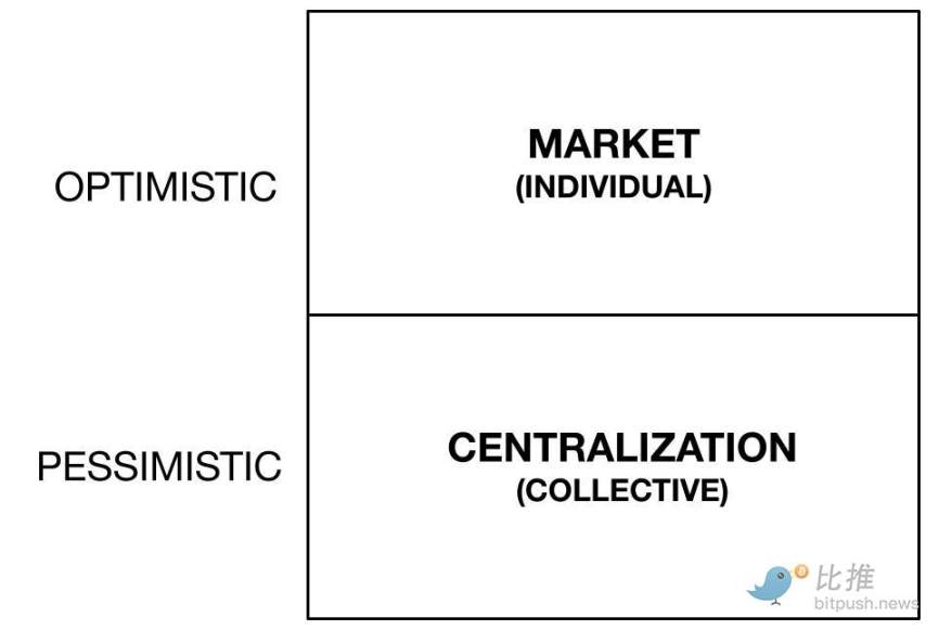 横向分界线在于个人的作用与集体的作用。乐观主义者强调个人作为变革的基础,他们更倾向于通过权力下放,实现自下而上的变革与稳健发展。相反,悲观主义者认为世界是脆弱的,他们寄希望于自上而下的控制,认为只有掌权者才能解决问题,防止事态进一步恶化。