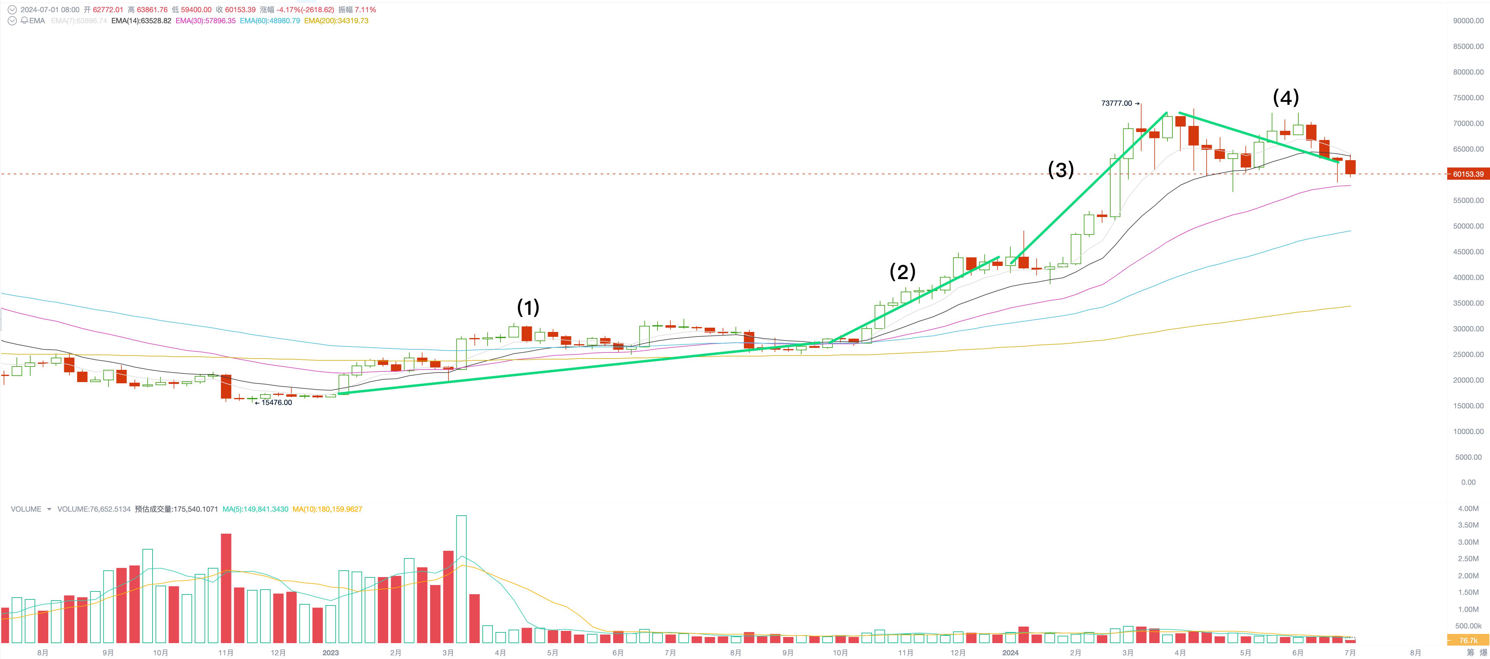 6 月,BTC 开于 67473.07 美元,收于 62668.26 美元,全月下跌 4804.15 美元计 7.12%,振幅 20.10%,成交量连续 3 个月萎缩。