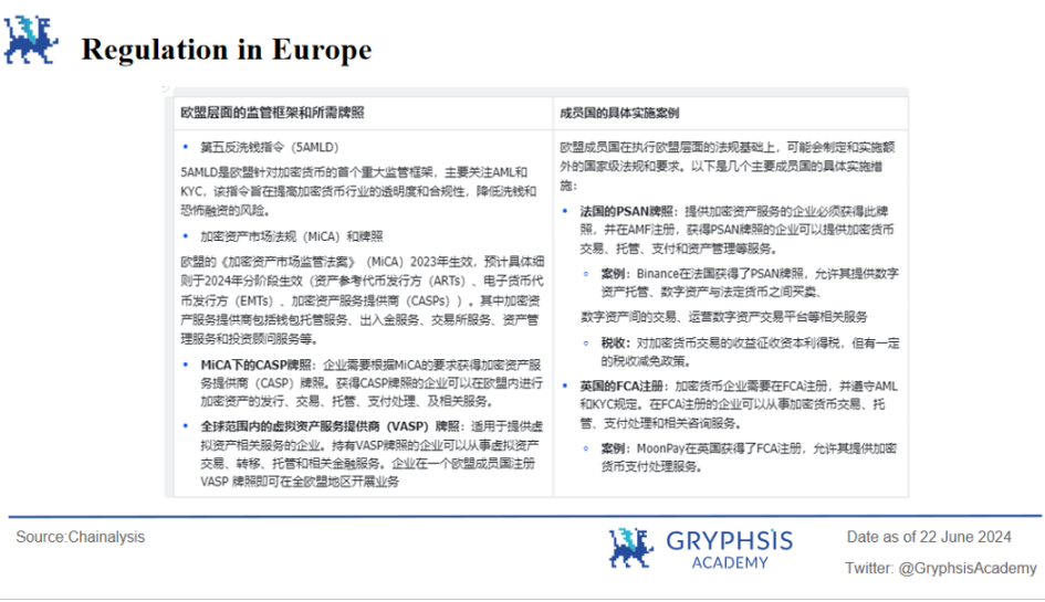 欧盟通过市场上的加密资产监管法案(MiCA)实现了 27 个成员国的统一监管,所有加密资产服务提供商(CASPs)需获得 MiCA 规定的牌照,并可以通过「护照机制」在整个欧盟范围内运营,直接形成了辐射到 27 个国家以及 4.5 亿的欧盟人口的加密资产大市场。