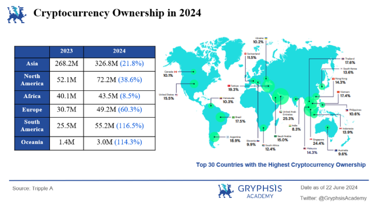 根据 Tripple A 的报告,截至 2024 年,加密货币的全球渗透率为 6.9%,全球范围内约有 5.6 亿人拥有加密货币,相比去年的 4.2 亿人增长了 33%。其中,亚洲是加密货币拥有最多的大洲,南美和大洋洲为占有比增长最快的地方(116.5%),迪拜的人口渗透率占比为 25.3%,为加密货币拥有人口占比最高的国家,配合着当地的金融自由区、个人所得税和资本利得税减免优势,这也解释了为什么迪拜会成为近两年很多交易所和加密公司的总部。