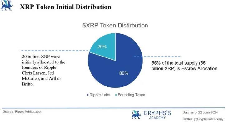 XRP 的供应量固定为 1,000 亿个代币,20% 为代币创始人所有,80% 为 Ripple 本身所有,即 800 亿代币。Ripple 最初分配的 250 亿 XRP 被分发、出售,另外 550 亿 XRP 被存入 55 个智能合约托管账户,每个合约包含 10 亿个 XRP 代币。
