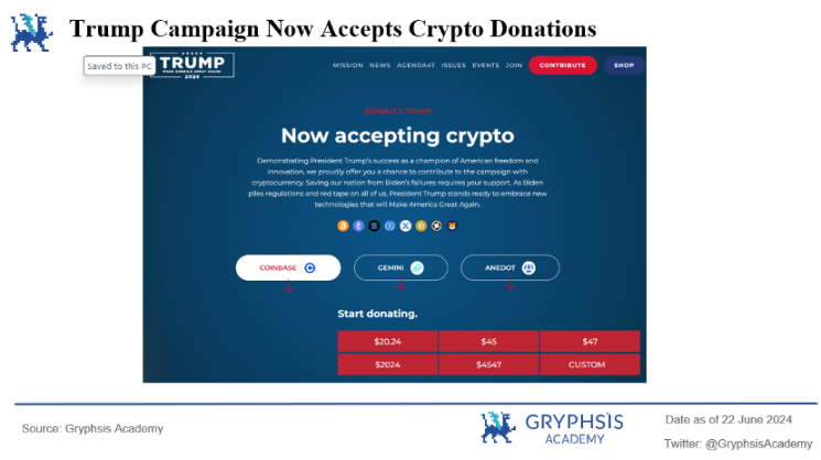 对美国来说,加密货币是大选的拉票利器。特朗普在这次的美国大选中,高调宣扬对加密货币的友好态度以及抨击拜登政府对加密货币的敌对态度。特朗普鼓励他的支持者通过 Coinbase Commerce 进行加密货币的捐款,一些列特朗普概念的 meme 币也因此一度炙手可热,六月底的大选辩论前,相关概念 meme 币也有明显的异动。