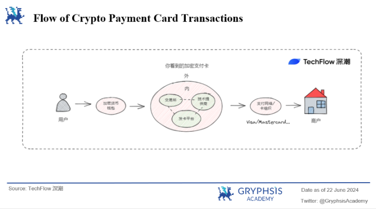 传统支付卡商或者 Web3 原生的支付卡商支持加密货币在实体经济的消费,这里有 4 个主体,帮助发卡商的技术服务商、发行商(传统卡商、 Web3 原生发卡方)、卡组织。