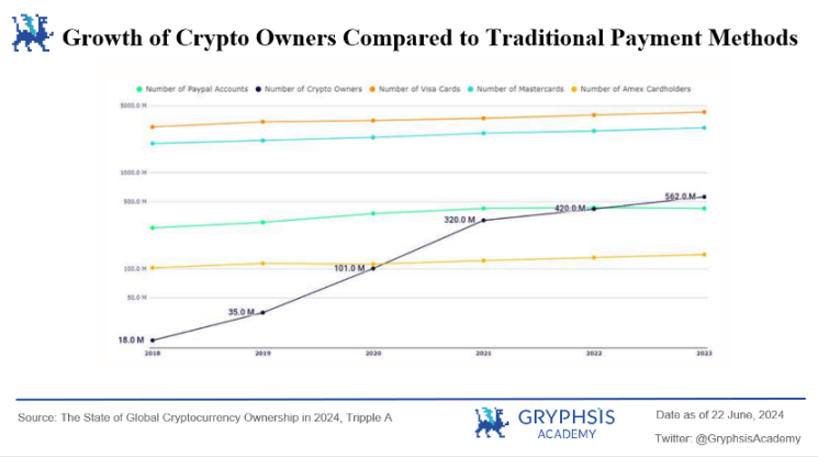 我们可以从图中了解到,从 2018 至 2023,加密货币占有水平的复合年增长率达到了 99%,远远超过传统支付方式的增长率 8%。在同一时期,加密货币占有水平的增长率超过了美国几家支付巨头。