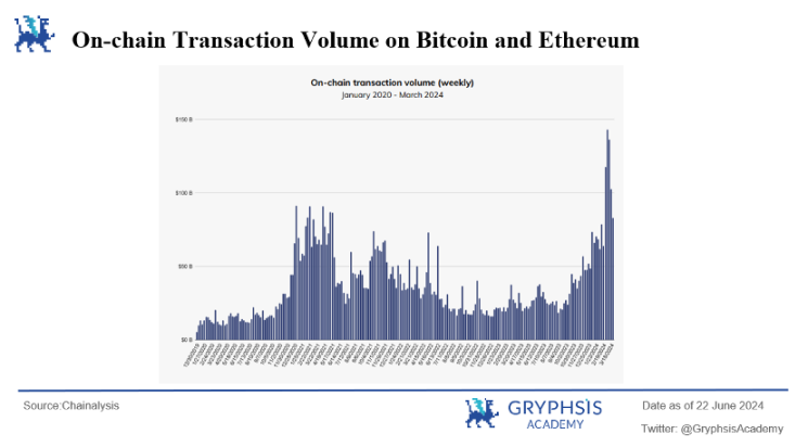 - 从链上数据来看,从 2020 年 1 月到 2024 年 3 月,链上交易量和交易活跃度持续增长。在一系列利好事件的推动下,这些指标屡次突破历史新高,即将突破 1,500 亿美元大关。