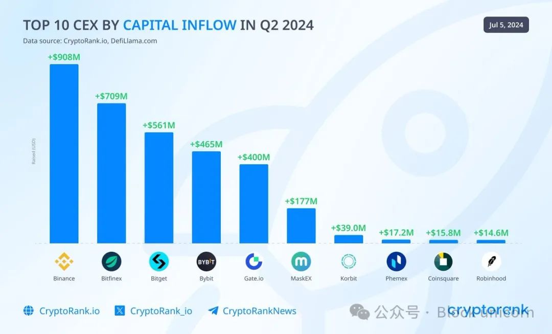 根据 CryptoRank.io 发布的 2024 年第二季度数据,Binance 以 9.08 亿美元的资金流入位居第一。Bitfinex 和 Bitget 分别以 7.09 亿美元和 5.61 亿美元位列第二和第三。在 Coingecko 的月访问量排名中,Binance 以 6,550 万次访问量继续领先,Bitget 排名第三,显示出其在用户活跃度和资金流入方面都有所增长。
