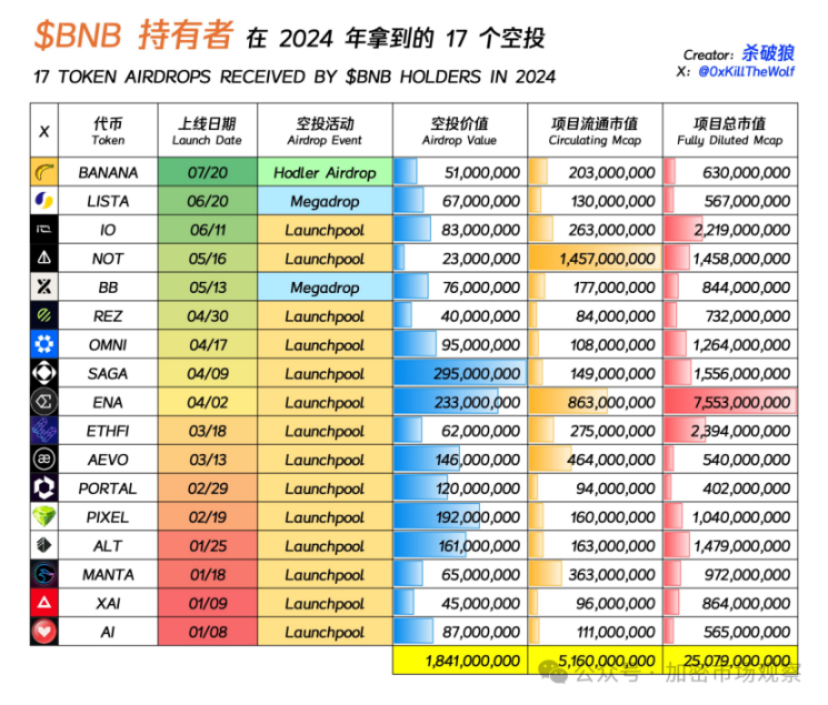 不仅如此,币安币还有比股票分红更频繁的空投,就有大 V 统计,仅 2024 年半年左右的 $B 时间,BNB 的持有者获得了价值 18.41 亿美金的项目代币空投,占 $BNB 目前总市值的 2.16%。
