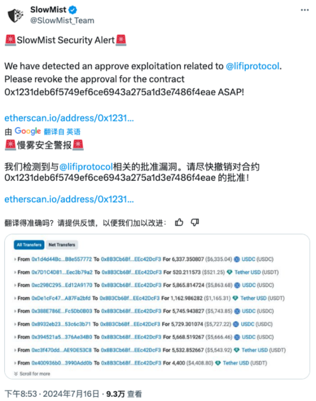 2024 年 7 月 16 日,据慢雾安全团队监测,跨链桥聚合协议 LI.FI 发生可疑交易,导致用户损失超过 1000 万美元。7 月 18 日,LI.FI 发布安全事件报告表示,该漏洞源于验证交易时出现的问题,该问题跟协议与多个去中心化交易所和其他 DeFi 协议使用的共享 LibSwap 代码库的交互方式有关,原因是在监督部署过程中出现个人人为错误。估计有 153 个钱包受到影响,损失价值约 1160 万美元的 USDC、USDT 和 DAI 稳定币。