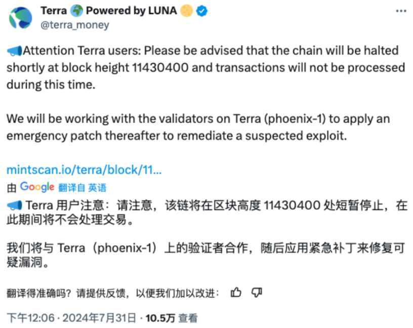 2024 年 7 月 31 日,Terra 链遭攻击,攻击者利用与第三方模块 IBC hooks 相关的已知漏洞在 Terra 链上铸造了数种代币,导致的损失已达 528 万美元。Terra 团队已采取紧急措施防止进一步损失,并协调验证者应用补丁以修复漏洞。据 Sommelier Finance 联合创始人 Zaki Manian 称,尽管该漏洞在 4 月已在 Cosmos 生态系统中修复,但 Terra 在 6 月的升级中未包含此补丁,导致漏洞再次暴露并被利用。