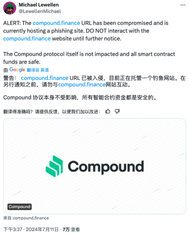 2024 年 7 月 11 日,Compound DAO 安全顾问 Michael Lewellen 发推表示,Compound Finance 官网被攻击,当前正在托管一个钓鱼网站。