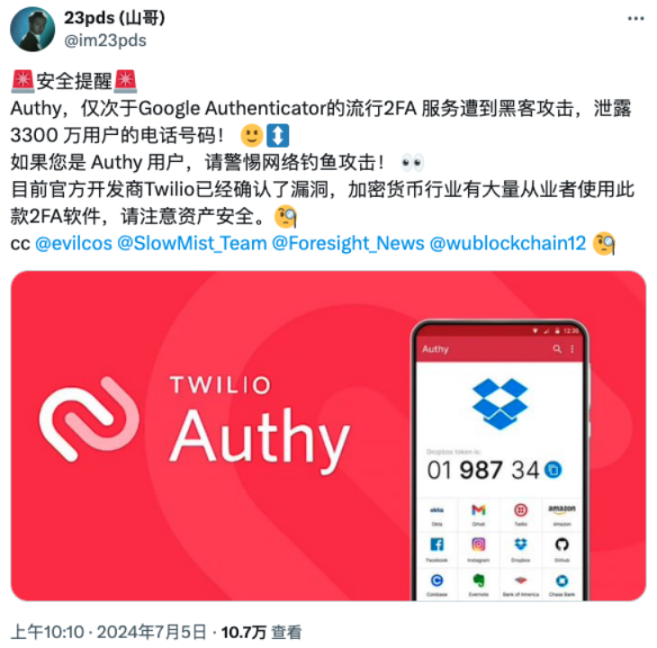 2024 年 7 月 5 日,慢雾首席信息安全官 23pds 发推表示,2FA 服务 Authy 遭攻击,导致 3300 万用户的电话号码被盗。官方开发者 Twilio 已确认该漏洞,有大量 Web3 用户使用这款 2FA 软件,请注意资产安全。