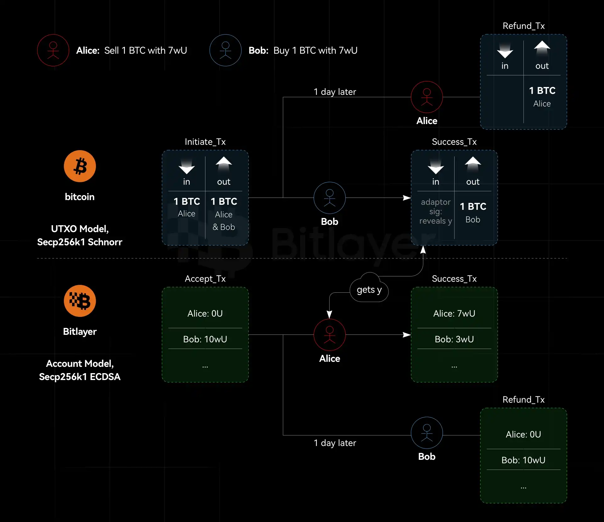 3. 与之相对应,Bob 基于其 adaptor secret t_B,重复步骤(2)。此时 Bob 所签的交易为将 funding output 发送给 Alice。