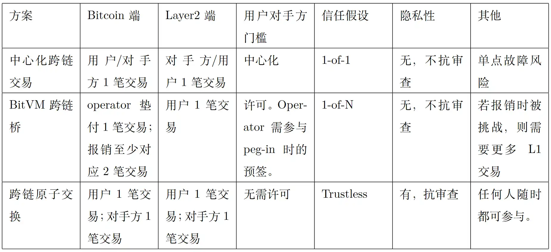 如表 1 所示,比特币与 Layer2 之间的跨链交易有三个典型方案,分别为中心化跨链交易、BitVM 跨链桥和跨链原子交换。这三个技术在信任假设、安全性、便捷性、交易额度等方面各不相同,能满足不同的应用需求。