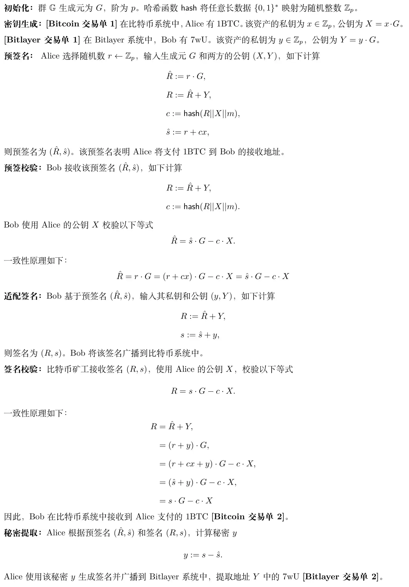 如图 2 所示,假设 Bitcoin 和 Bitlayer 均使用 Secp256k1 曲线,但是 Bitcoin 使用 Schnorr 签名,而 Bitlayer 使用 ECDSA。该情况下,基于 Schnorr 和 ECDSA 的适配器签名,是可证明安全的。假设给定 ECDSA 和 Schnorr 签名预言机,能够构造模拟器 S 攻破 ECDSA,则仅给定 ECDSA 签名预言机,能够构造模拟器 S 攻破 ECDSA。但是,ECDSA 是安全的。同理,假设给定 ECDSA 和 Schnorr 签名预言机,能够构造模拟器 S 攻破 Schnorr 签名,则仅给定 ECDSA 签名预言机,能够构造模拟器 S 攻破 Schnorr 签名。但是,Schnorr 签名是安全的。因此,在跨链场景下,适配器签名使用了相同曲线,但是签名算法不同,则是安全的。换言之,适配器签名允许一端使用 ECDSA,而另一端使用 Schnorr 签名。