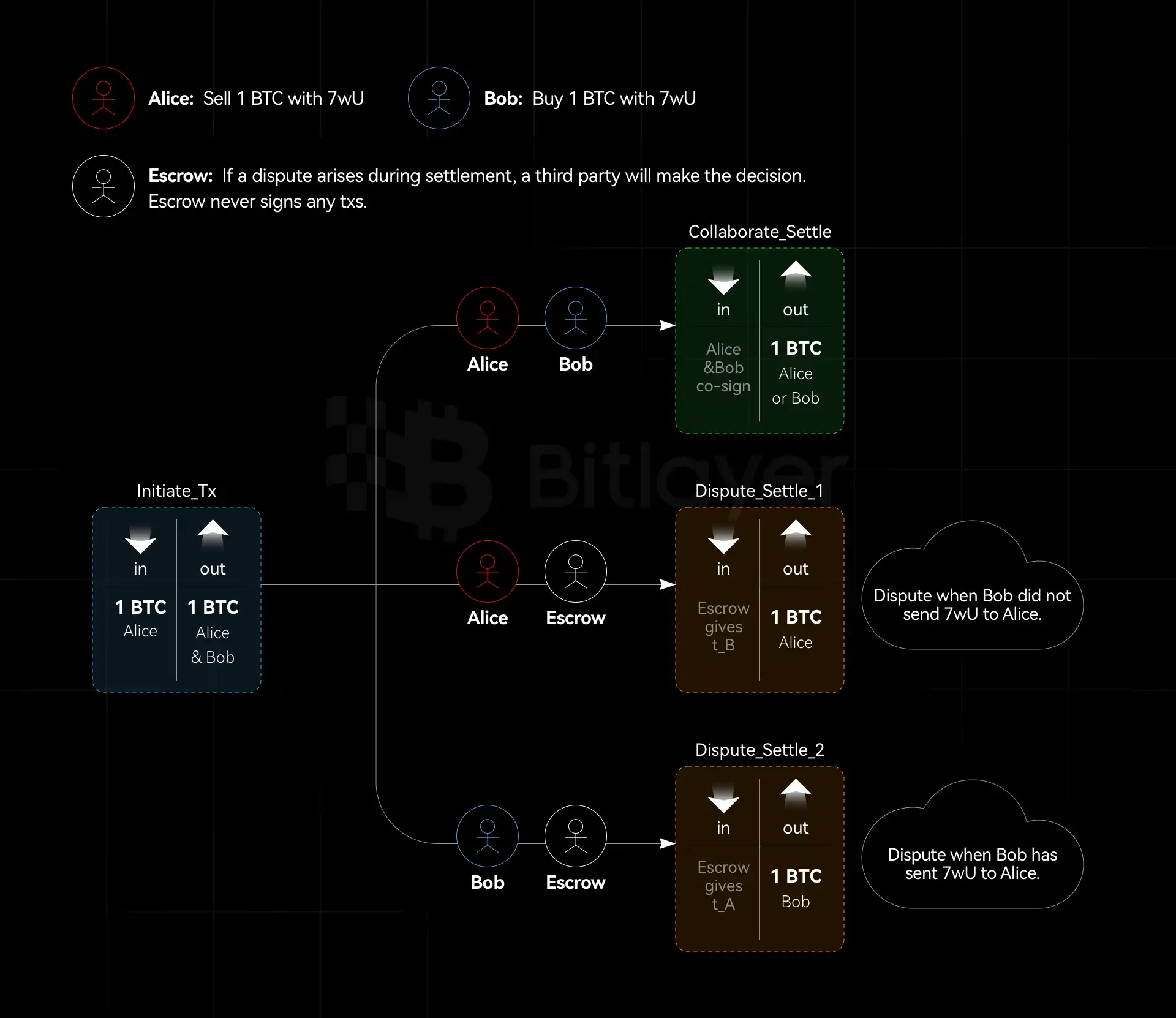 如果无争议,则 Alice 和 Bob 可按其所想来花费 2-of-2 MuSig output。如果存在争议,则任何一方均可联系托管方,并请求其 adaptor secret t_A 或 t_B。因此,其中一方在托管方的帮助下,可完成该适配器签名,并广播该结算交易。