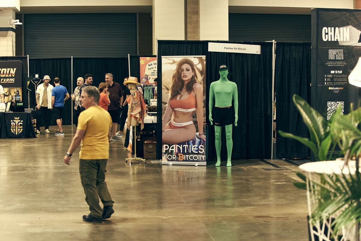 周五早上,当我走进纳什维尔音乐城中心举行的比特币会议时,我发现会议与我参加过的其他会议没什么不同,除了印有「让美国再次伟大」或「让比特币再次伟大」的红色大写字母。更典型的是随处可见的橙色「B」符号。狂热的爱好者们兜售比特币儿童读物、比特币被子和令人尴尬的比特币艺术品,上面有更多橙色「B」和烧毁、捣碎或撕碎的政府货币。(特朗普从不错过任何推广产品的机会,后来他在 Truth Social 上推销橙色比特币运动鞋。)一位身穿比基尼的模特用比特币矿机加热的水喷洒自己。我还看到因「hawk tuah」而走红的 Hailey Welch 正在一个出售橙色内衣的摊位前驻足。