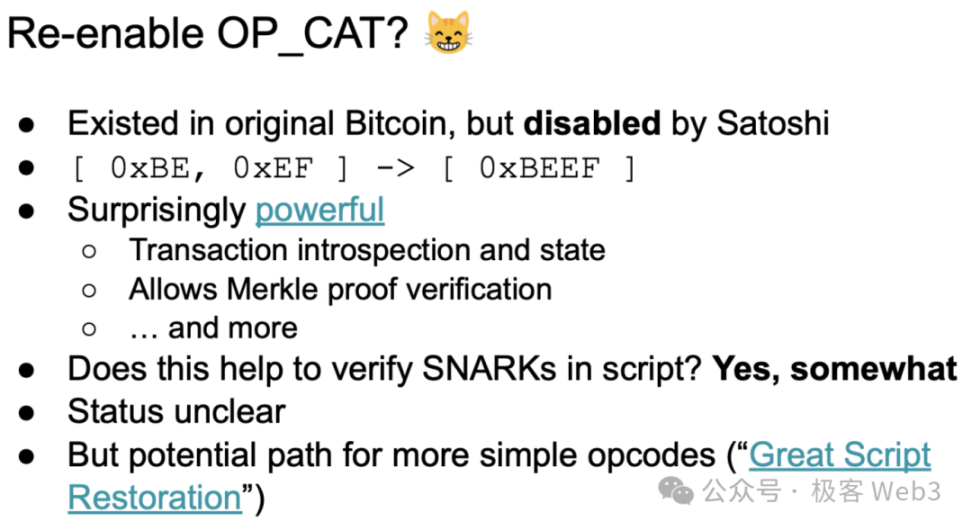 综上,比特币可能会有一个潜在路径,通过启用如 OP_CAT 这样的简单操作码,让大家可以用比特币脚本中验证 SNARK。另外值得一提的是,最近有一个名为「Great Script Restoration」的提案,启用了乘法操作码,允许所有算术操作码以任意精度操作。
