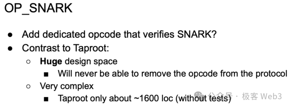 话说回来,既然比特币有 Tarpoot 这样添加较强大功能的先例,为什么不添加一个专用的操作码来验证 SNARK 呢?这是因为添加一个所谓的 OP_SNARK 操作码与 Taproot 升级有很大不同。