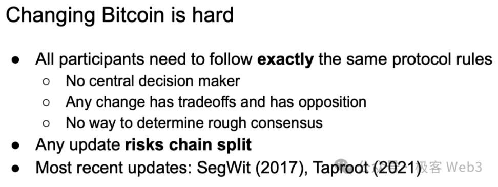 其实有很多技术手段可以解决比特币身上存在的问题,但为什么直到今天,这些技术仍没有被加入到比特币协议中?这是因为比特币协议很难被修改。比特币生态里没有类似于以太坊基金会的组织,对协议的任何修改都需要社区达到高度共识才行,这里涉及到大量的博弈和权力制衡,所以不同于以太坊那样每年都会有 EVM 操作码的更新,比特币协议自问世以来,变更就非常少。