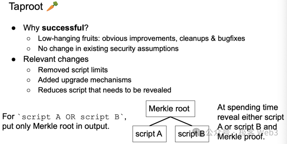 第二,Taproot 缩减了需要在链上揭示的脚本数据,你可以将多段脚本程序组装为一棵 Merkle 树,每段脚本位于不同的叶子上,如果你要触发某段脚本,只需揭示出示其所在的叶子及 Merkle 证明;