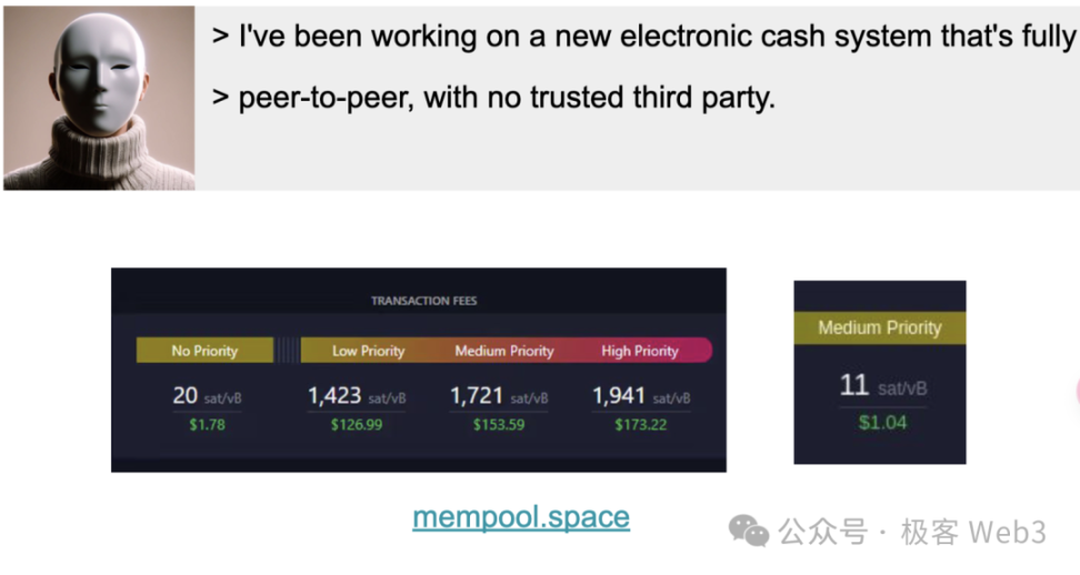 然而,比特币在产品设计层面限制了数据吞吐量。其单位时间内能处理的交易笔数有限,如果待处理的交易数量快速上升,用户为了快点交易成功,就会发起价格战,迅速拉高付出的手续费。比特币网络内手续费最高的单笔交易出现在 2024 年出块奖励减半后,一笔上链优先级中等的交易手续费达到 150 美元。可以说,比特币网络昂贵的交易手续费已成为一个难题。