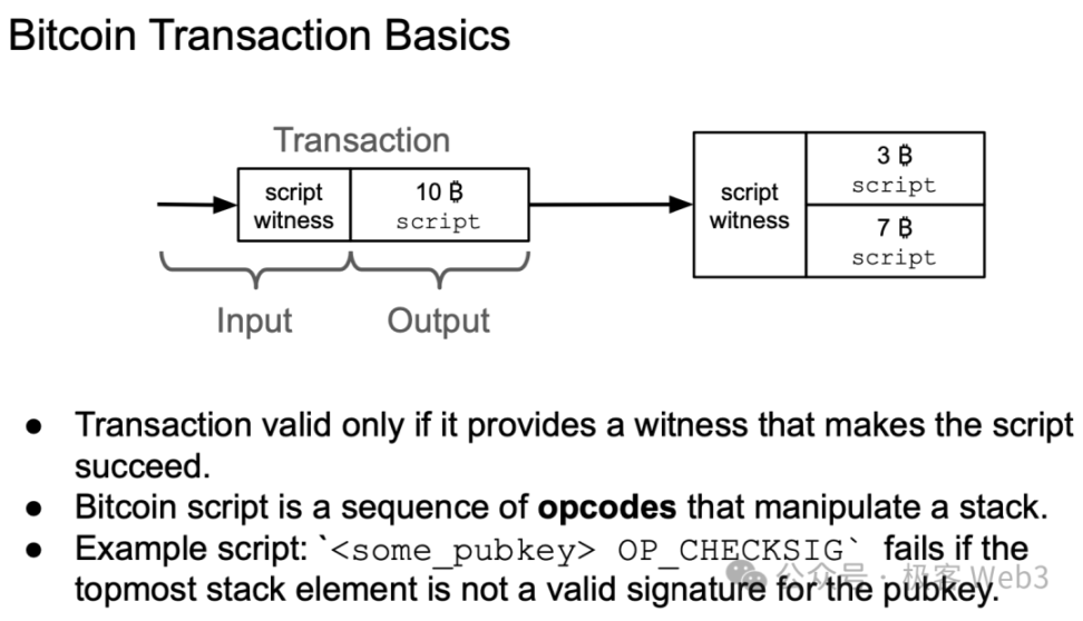 当然,除了关联的 BTC 数额外,每个交易输出都有一段附加程序,用一种叫比特币脚本的语言来编写。谁能向这段程序出示正确的证明 Witness,谁就能花费这笔交易输出(UTXO)。比特币脚本本身是一种基于堆栈的编程语言,包含一系列操作码,前述 UTXO 的附加程序往往由多个操作码组成,它们基于堆栈完成计算并将结果再放回堆栈。