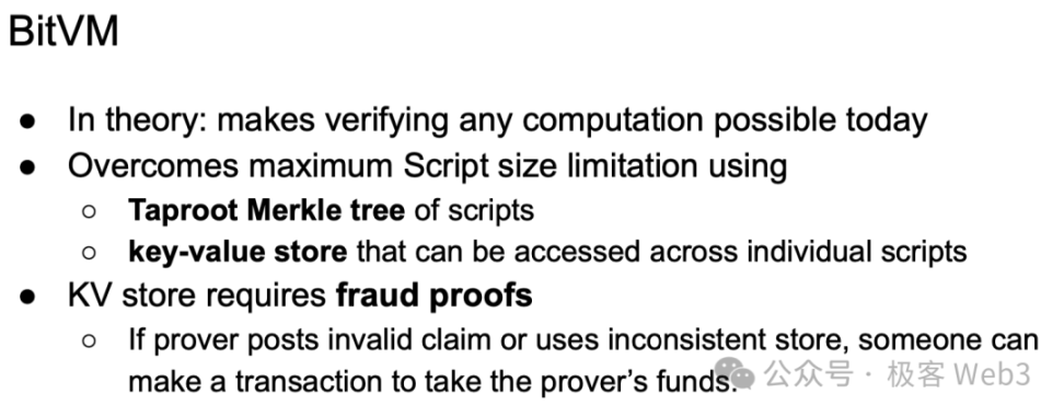 其次,它启用了可以跨单个脚本访问的 KV 存储方案,允许连接到超级多的脚本程序。不过,比特币协议不强制保证上述 KV 存储方案的完整性,BitVM 需要通过欺诈证明来检查恶意 Prover,如果 Prover 发布无效声明或有问题的 KV 存储,其他人可以在比特币链上发起一笔交易,表明 Prover 行为不当,并取走其事先质押的资产。