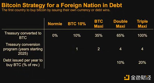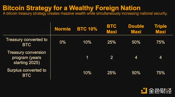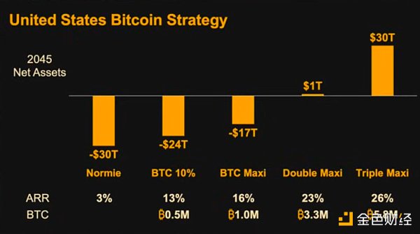 那么,美国的比特币策略是什么?我们可以是普通策略者;可以是10%策略者,购买50万个比特币;可以是最大主义者,购买100万个比特币;双重最大主义策略者,购买200万个比特币;三重最大主义策略者,购买400万个比特币。然后开始把国家的盈余转化为比特币。