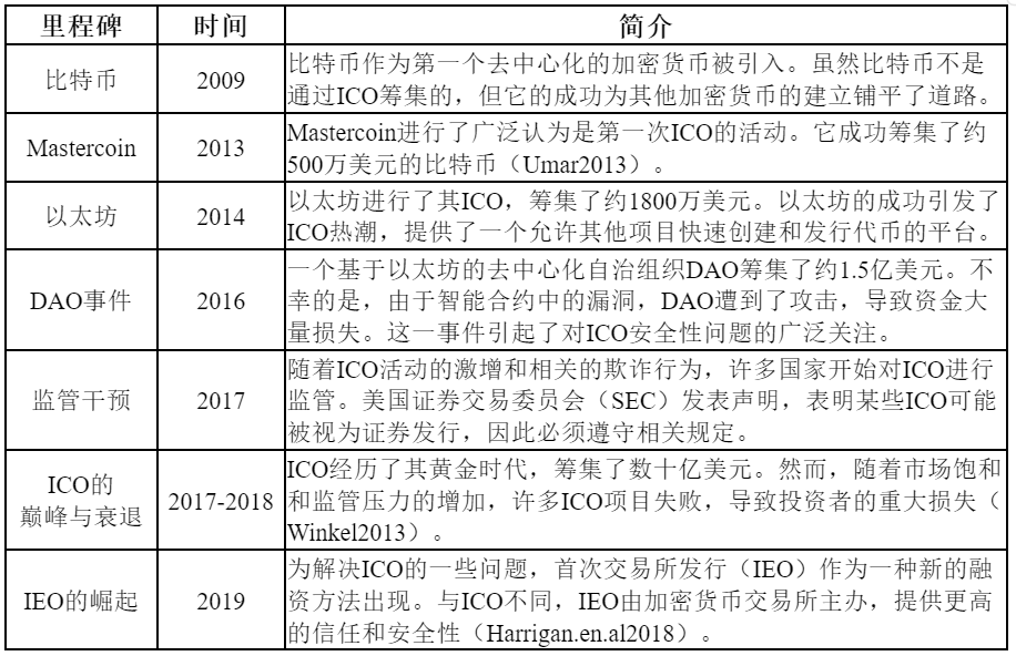ICO 概念起源于 Mastercoin 的出现。其受欢迎程度在以太坊网络于 2015 年启动后激增。表 1 显示了 ICO 的关键里程碑(Zheng.et.al2020)。