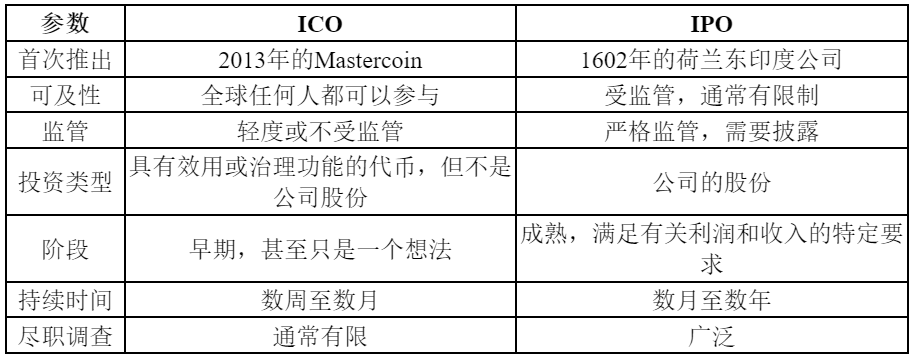 IPO 通常仅限于机构投资者或在早期阶段拥有大量资本的投资者。ICO 则民主化了这一过程,使任何拥有互联网连接和一些加密货币的人都能参与。表 2 总结了 ICO 和 IPO 之间的比较。