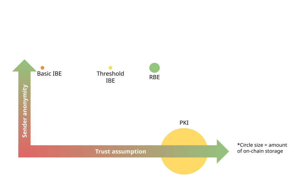 对于上述的问题,目前有三种解决方案:Public Key Directory、基于身份的加密(IBE)、和基于注册的加密(RBE)。这三种方法在匿名性、交互性和效率上各有各的优点。例如,IBE 需要强大的信任基础,但在某些情况下,IBE 在匿名性和效率上表现更好。本文旨在探索这三种方法在区块链上的应用,并比较它们的优缺点。