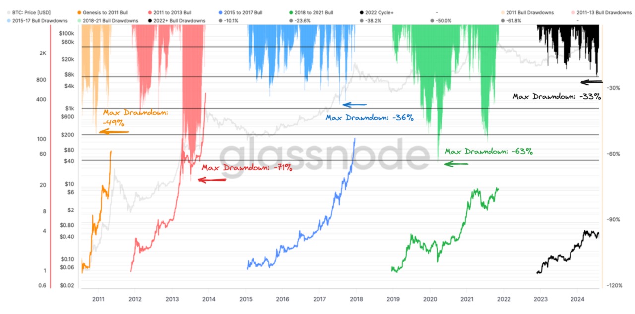 Animoca Digital Research :我们认为加密货币市场截至2024年8月依然处于牛市周期。尽管全球资产市场近期出现了一些波动,但中期前景依然乐观。与之前的周期对比,当前周期尚未到达峰值。近期约30%的修正完全在历史范围内,符合牛市调整的常规模式。