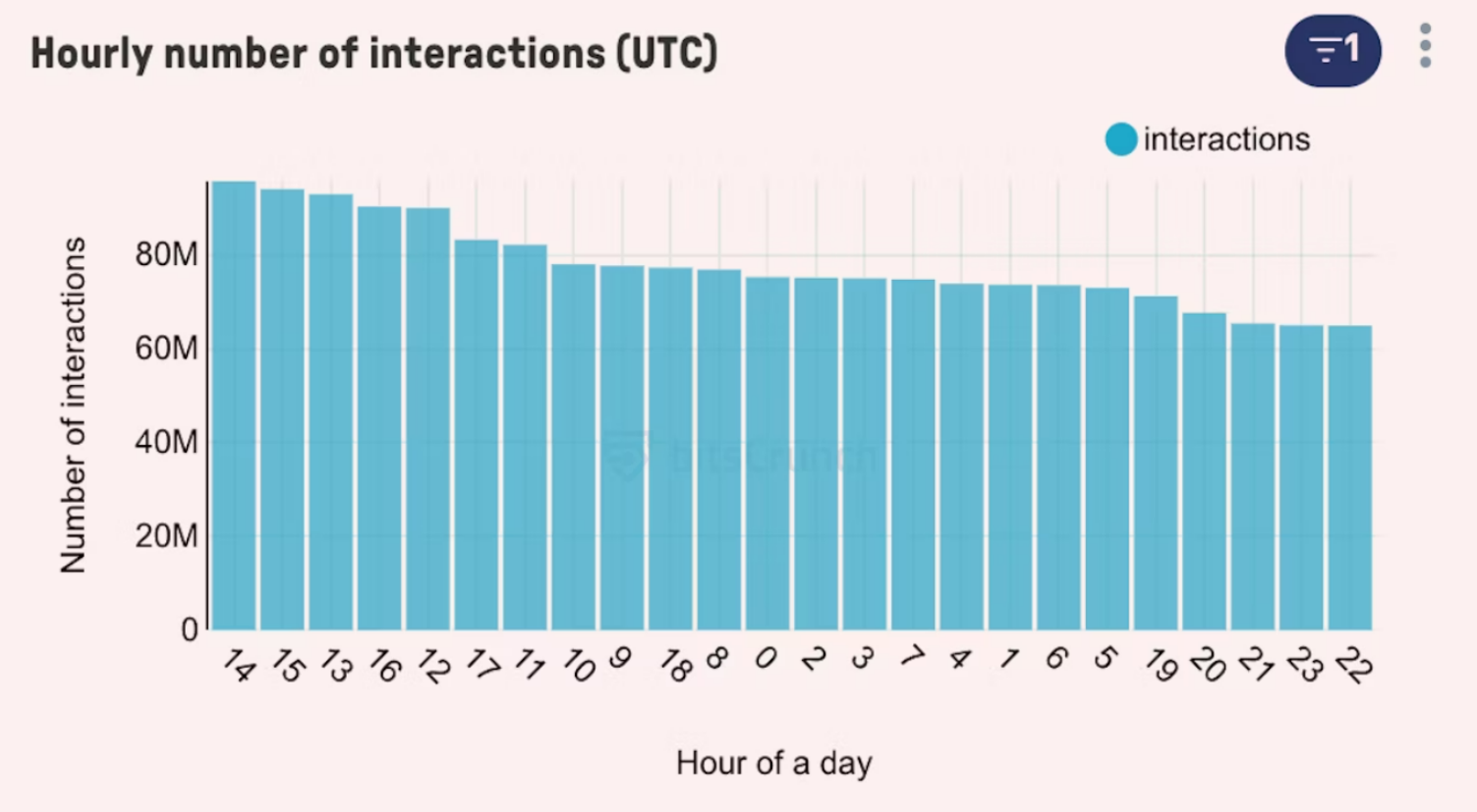 对游戏活动的分析显示,在 UTC 时区的下午时段参与度最高,交易频率超过 9500 万次。这一时间段对应美国的早晨和亚洲的晚上。活动量在 UTC 夜间最低,下降到峰值水平的约三分之二。