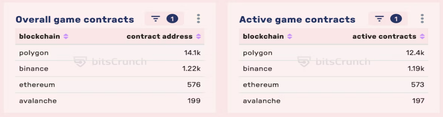在活跃的游戏智能合约数量方面,Polygon 以约 12,400 个合约领先。BNB Chain 紧随其后,但合约数量仅为 Polygon 的十分之一左右。以太坊和 Avalanche 落后较多,每个区块链上仅有几百个游戏合约。这种分布的原因包括交易成本、速度和生态系统支持等因素。