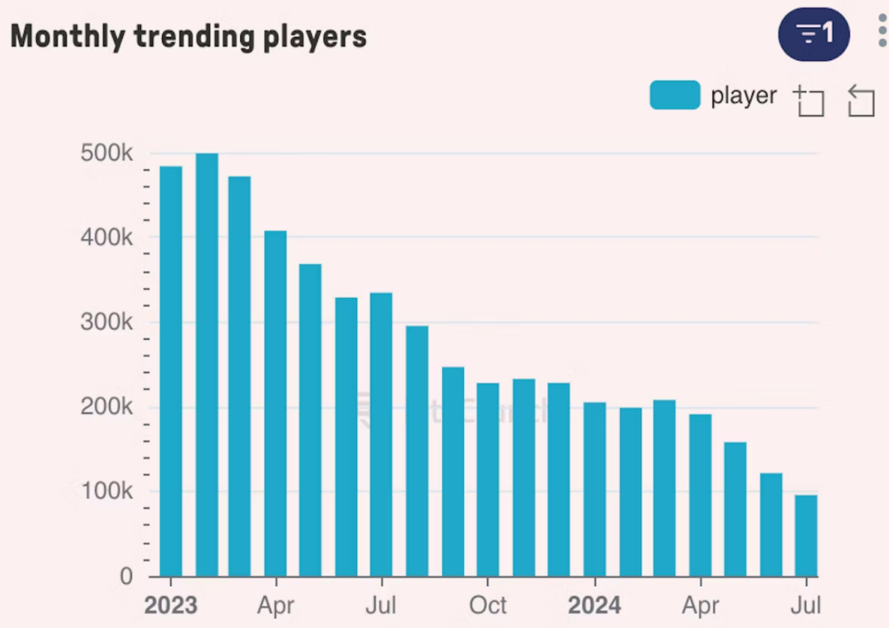 自 2023 年以来,Web3 游戏的玩家数量逐渐下降。玩家基础从 2023 年的 603 万人缩减到目前大约 100 万月活跃用户。