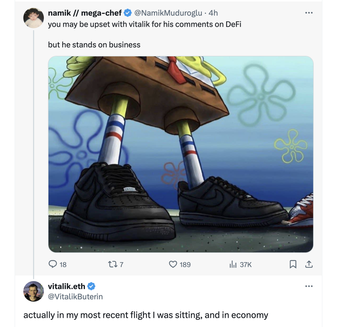 针对 Vitalik 收到的反对声音,有人替他辩解到:「你可能会因为 Vitalik 对 DeFi 的评论感到不满,但他是站在商业的立场上。」Vitalik 在回复中幽默回应:「事实上,我在最近的飞行中是坐着的,而且坐的是经济舱。