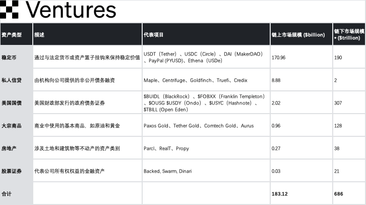 链上现实世界资产(RWA)的总市值为 183.12 亿美元,而链下传统资产的总市值为 685.5 万亿美元。假设链下传统资产的总市值每天增加 1 个基点(1bps,0.01%),这将带来约 68.5 亿美元的增量,接近链上资产市值的37%。从这个角度看,链下资产即使是微小的增长,也能对链上资产产生巨大的推动作用。