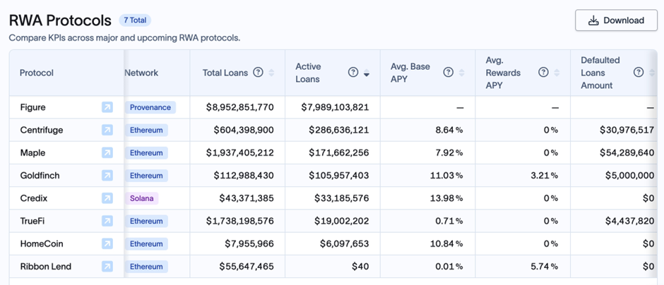 - Maple Finance: 提供链上私人信贷,通过代币化的信用协议,为企业提供快速融资,同时为出借方提供高收益的投资机会, 类似的模式还有TrueFi (和Maple一样也提供美国国债产品)以及Goldfinch。