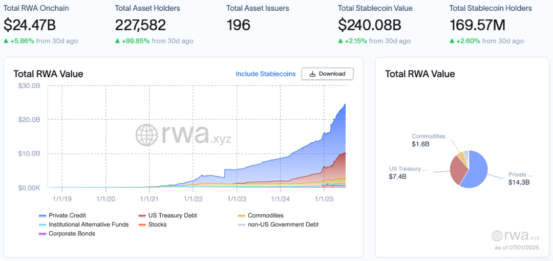 据 RWA.xyz 数据,截至 6 月 30 日,代币化现实资产总市值达 244.7 亿美元,其中代币化美国国债市值 73.85 亿美元,而代币化股票市值仅 3.41 亿美元。