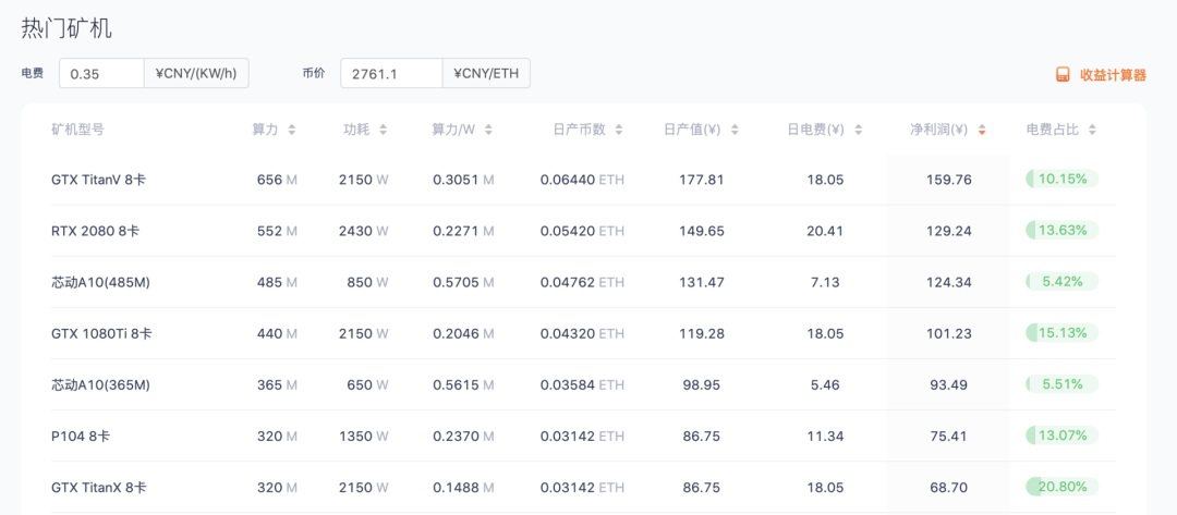 目前,按照每度电3毛5的电价计算,以太坊部分主流矿机的日净收益超过了 90元,电费占比不到 20%。