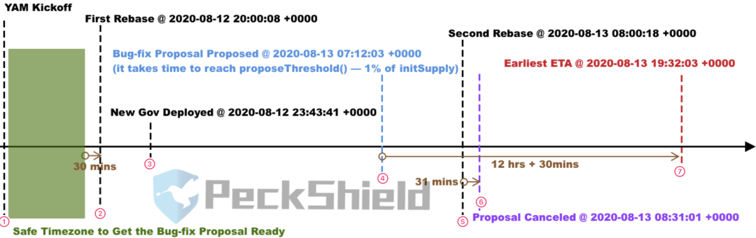 ②是第一次 rebase 触发的时间,由于合约的 bug 导致 totalsupply 资产发生异常暴涨,官方发现 BUG 存在并进行了披露。 ③是官方宣布提议部署新治理合约的时间,在此之后社区开始启动投票。 ④是投票目标初步完成,新治理合约进入执行排列的时间,自此等待执行12.5小时合约正式执行。 ⑤是第二次 rebase 的触发时间。 ⑦是其新治理合约投票通过后正式执行的时间。 ⑥ 在第二次 rebase 触发后的第31分钟时,或许是项目方发现了已经无力回天了,提案取消成功,项目方正式宣布 YAM 失败。 ①之后的绿色区域是投票和提案拯救行动可以成功的“黄金急救期”,需要整个拯救行动准备工作在第一次 rebase 触发之前半小时内完成。(即蓝色虚线应提前到绿色区域内)。 这意味着,YAM 官方应在第一次 rebase(北京时间08月13日凌晨04:08)之前就应该发现这个漏洞,并且留有足够的时间完成新治理合约部署和投票。