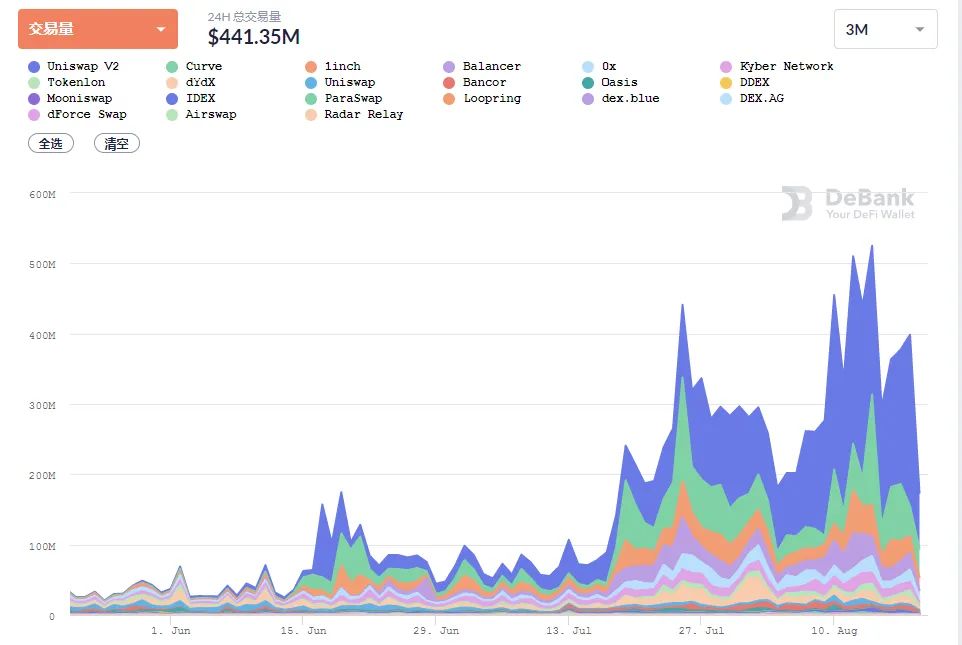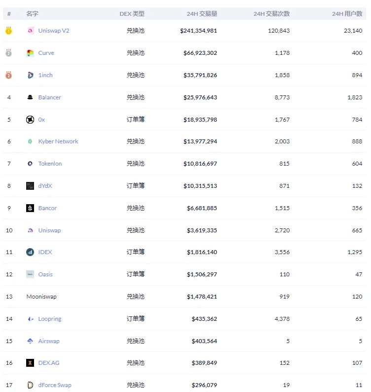 对比整体DeFi生态中的其他交易所数据: