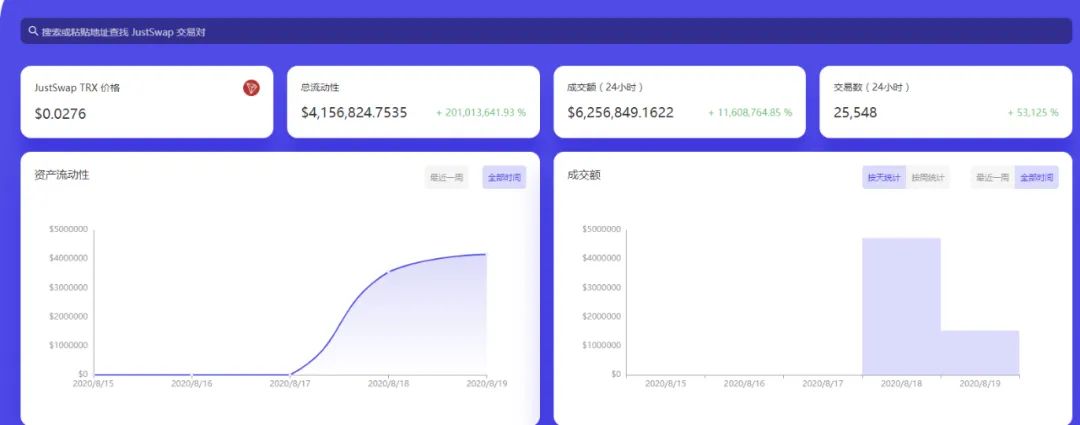 JustSwap官网数据。上线还不到24小时,交易金额为625万美金,交易次数2.5万次。