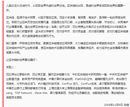 为了更好地推动区块链行业健康发展,主办方巴比特携手与会嘉宾共同发起《2019乌镇区块链宣言》,表示将积极响应政府号召,聚焦区块链落地应用探索,大力推进区块链技术赋能实体经济,加快推动区块链技术和产业创新发展,将带头坚决反对传销币,反对空气币,反对打着区块链旗号的伪应用;反对虚假造概念的跟风行为。